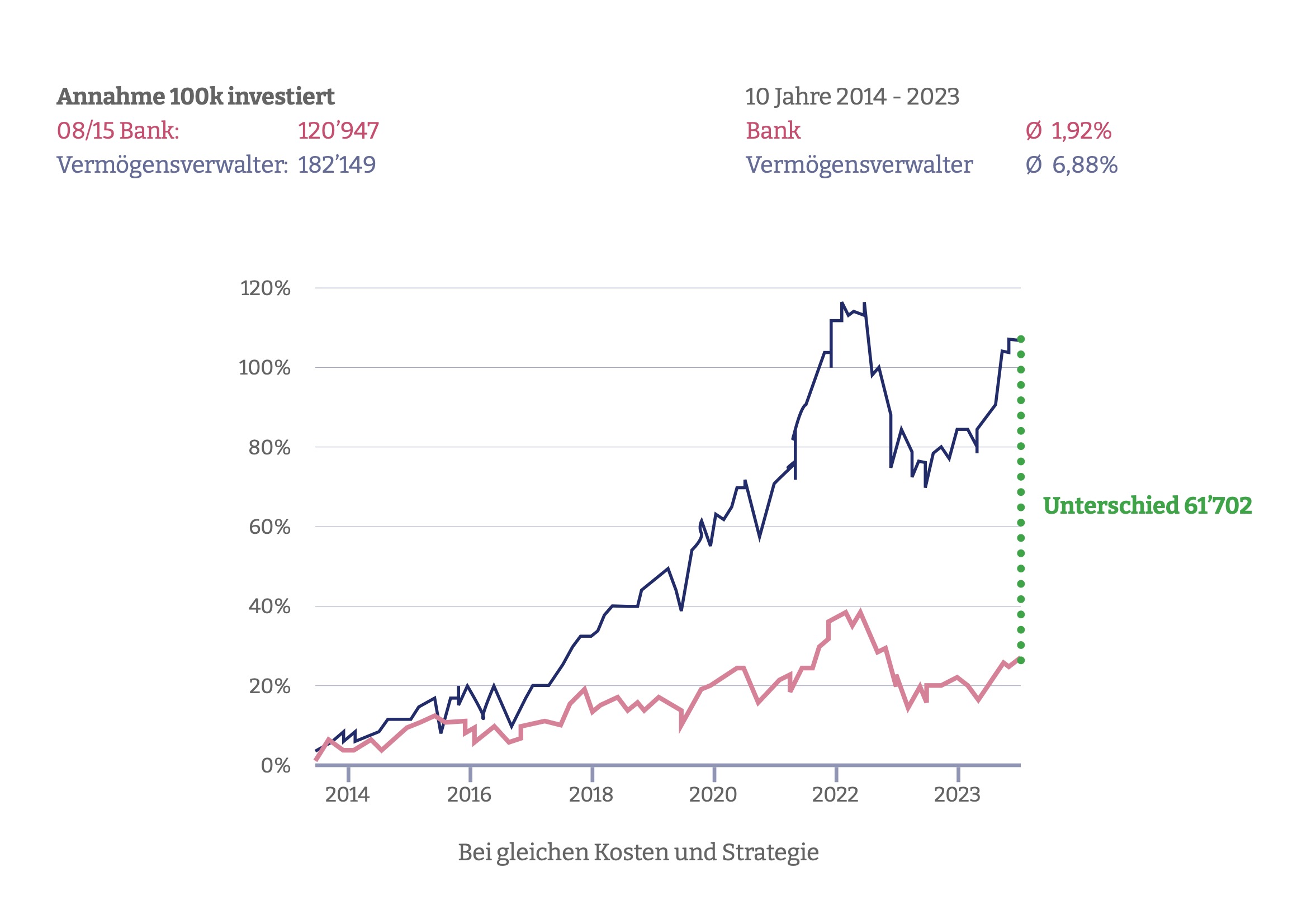 Andere Berater sind an ihre Bankprodukte gebunden oder haben nur Grundwissen. Das kostet dich jährlich mehrere Prozent Rendite, auch wenn Du es selber verwaltest wirst du höchst wahrscheinlich dein Potenzial nicht voll ausschöpfen.