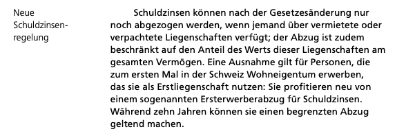 Ferienliegenschaft CHF 600'000 Bankkonto CHF 400'000 Total Privatvermögen CHF 1'000'000 Hypothekarzinsen CHF 12'000 → steuerlich abzugsfähig = CHF 0